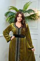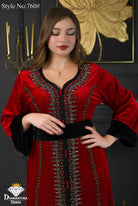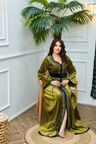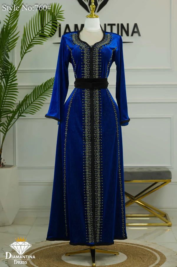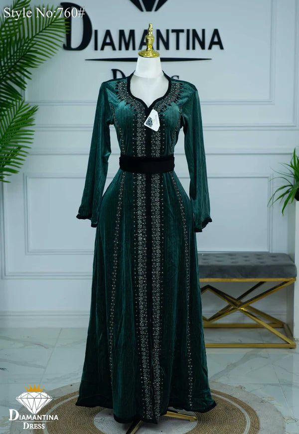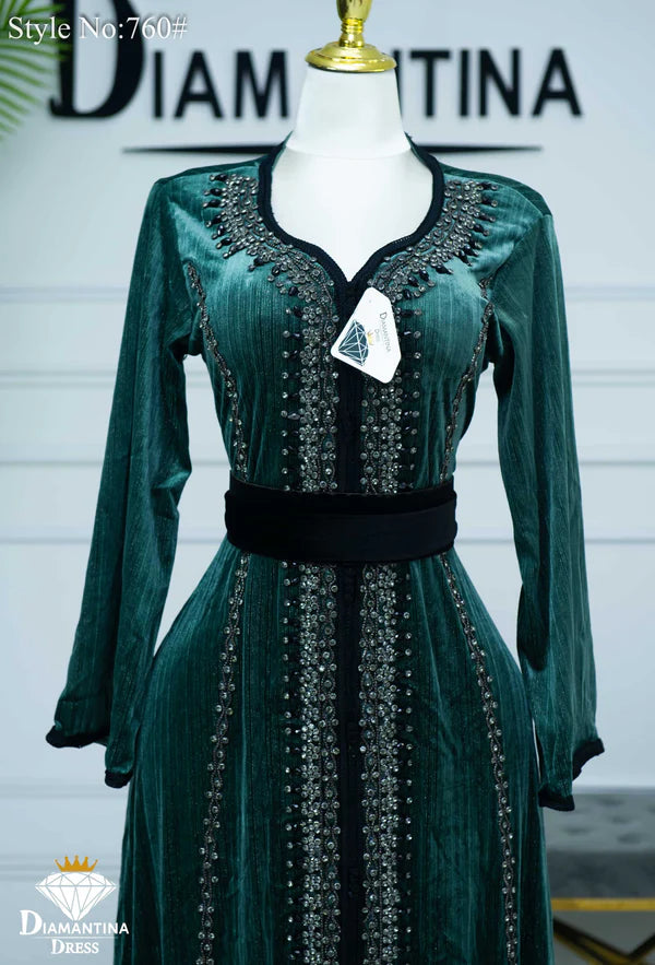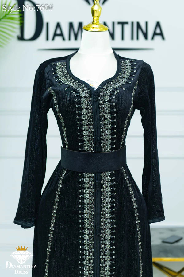 قفطان فاخر بفصالة إيفازي، مصنوع من مخمل بالسلك ناعم وحصري بعلامة ديامنتينا، مزين بـسفيفة من الحرير الأسود وأحجار كريستال وحجر يقوت أسود زجاجي حر يلمع. يتميز بالحزام الأنيق ويليق بمقاسات من 40 إلى 52. الأناقة في مظهره تتجلى أكثر عند ارتدائه، ليمنحك إطلالة ساحرة وفاخرة